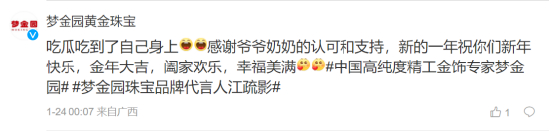 而@梦金园黄金珠宝 官微也现身评论区:“吃瓜吃到了自己身上感谢爷爷奶奶的认可和支持,新的一年祝你们新年快乐,金年大吉,阖家欢乐,幸福美满。”并且带上了广告#中国高纯度精工金饰专家梦金园# #梦金园珠宝品牌代言人江疏影#