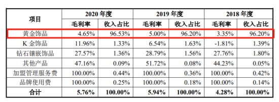 背后的原因是,梦金园虽然拥有黄金饰品、K金饰品、钻石镶嵌饰品、加盟管理服务费、品牌使用费等多元化的收入,但黄金饰品一直在收入中的占比高达96%,而黄金饰品又是这几类产品中毛利率最低的,这拖累了梦金园的整体毛利率水平。