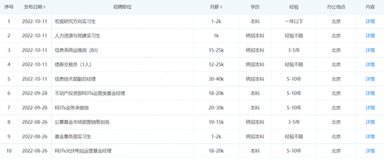 据企查查统计,中航基金最近半年公开发布了十余项base北京的招聘职位。其中,职级最高的信息技术部副总经理,要求5-10年工作经验,月薪3万到4万。债券交易员、基金经理、REITs业务承做岗等专业性的职位,月薪也不过万把块钱。