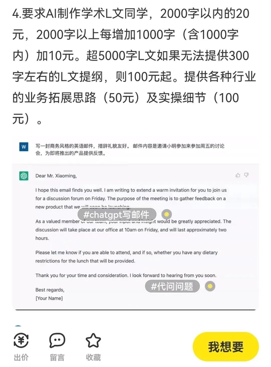 考虑到目前个人用户在官网注册使用ChatGPT尚不需要收费,代提问可以说是零成本支出、只看回报的服务。
