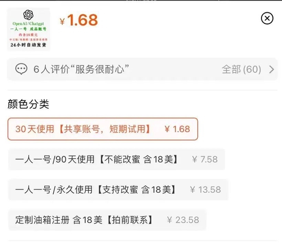 以其中一家名为“ChatGPT小店”的淘宝店铺为例,店内最火的一款“ChatGPT账号注册”商品有超46000人感兴趣,6万+人已付款。该款链接下包含从1.68元至23.58元四个不同价位选项,主要提供ChatGPT成品账号和登录教程。随后,记者拍下了店内一款产品,收到了客服发来的ChatGPT卡号、密码以及OpenAI登录教程。记者尝试添加售后客服微信时发现,对方被添加次数过于频繁,多次尝试均显示添加失败,此外,淘宝店铺客服也由于咨询量巨大目前只提供自动回复服务。