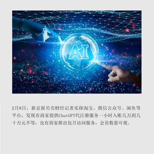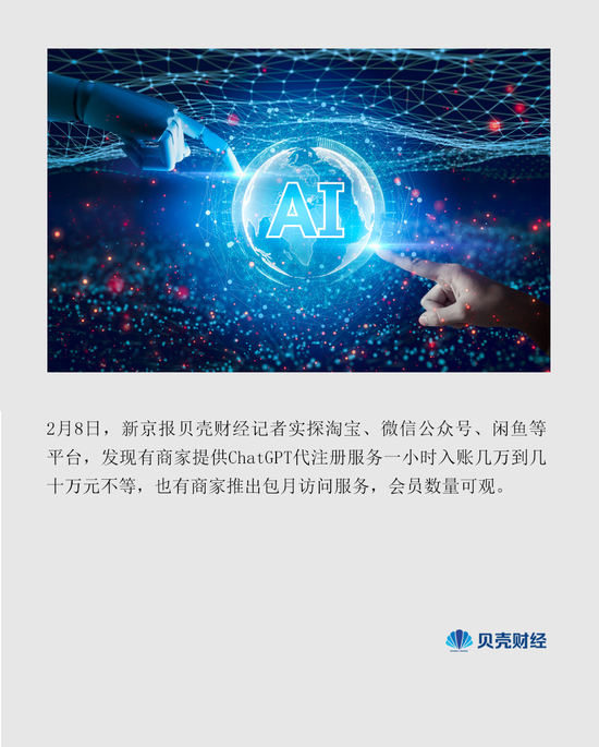 2月8日,贝壳财经记者实探淘宝、微信公众号、闲鱼等平台,发现有商家提供ChatGPT代注册服务一小时入账几万到几十万元不等,也有商家推出包月访问服务,会员数量可观。官方信息显示,目前ChatGPT尚未推出国内版本。