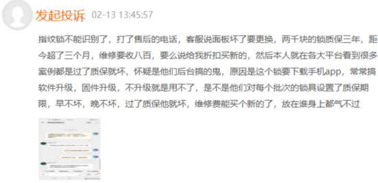 除了智能锁的质量问题,客服的拖延推诿等售后服务差也是不少消费者诟病的方面。