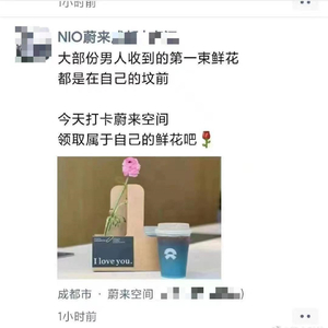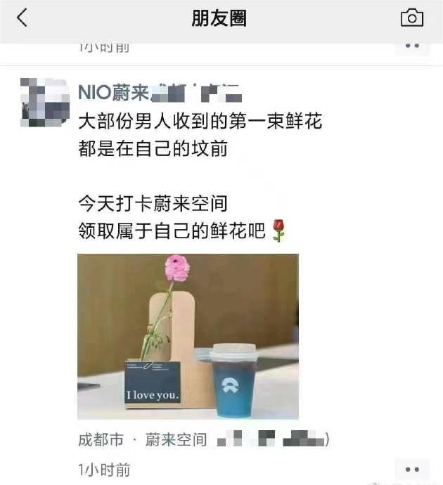 网络上流传的截图显示,一位成都某蔚来门店员工今日在朋友圈发布文案称,“大部分男人收到的第一束鲜花,都是在自己的坟前。今天打卡蔚来空间,领取属于自己的鲜花吧。”