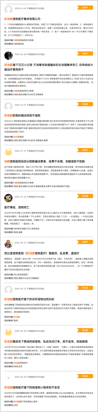 在黑猫投诉平台,有多起关于新瑞鹏旗下企业的投诉信息,涉及医师不专业导致宠物伤亡、诱导消费、虚假宣传、恶意加价收费等等。