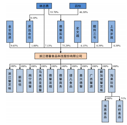 德馨食品实控人为林志勇,其直接持有公司7.13%的股份,并通过德馨实业间接持股40.44%,合计持有47.57%的股份。同时,德馨食品采用同股不同权机制,林志勇间接控制德馨实业持有的公司75.29%的表决权,并通过昇远合伙持有1%的表决权,合计控制公司76.29%的表决权。史文超和吕怡均为林志勇的一致行动人。