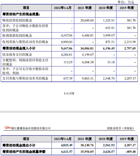 吸收外部投资的现金后,德馨食品拿出不少用于还债和分红。2021年,公司偿还债务4199.07万元,支付借款保证金4900万元,子公司新联恒归还购买日前形成的拆借款项3485.64万元(其中包含支付史文超拆借款300万元),分配股利、利润或偿付利息4068.38万元,合计约1.67亿元。