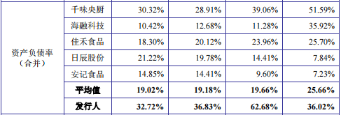 2019年-2022年上半年,德馨食品的资产负债率分别为36.02%、62.68%、36.83%及32.72%,而同期行业可比公司资产负债率平均值分别为25.66%、19.66%、19.18%及19.02%。对比之下,德馨食品负债水平远超同行业均值,德馨食品存在相对较大的债务压力。