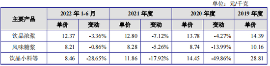 实际上,近些年来,德馨食品主要产品的销售价格均连年下跌。2019年,饮品浓浆、风味糖浆、饮品小料的销售单价分别为14.39元/千克、10.16元/千克、28.81元/千克,而2022上半年已跌至12.37元/千克、8.21元/千克、8.46元/千克。其中,饮品小料销售单价降幅超过70%。
