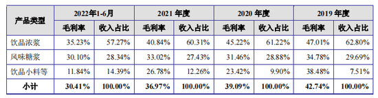 2022年上半年,德馨食品饮品浓浆、风味糖浆、饮品小料三大主营业务毛利率齐降,较2021年分别下降5.61个百分点、2.92个百分点、14.94个百分点。