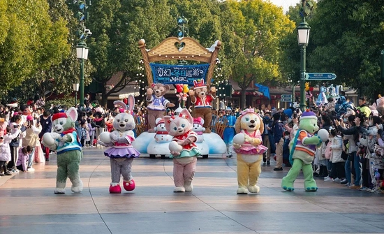 2023年2月1日,上海迪士尼乐园内正在进行冬季主题花车巡游,游客们热情互动。图/视觉中国