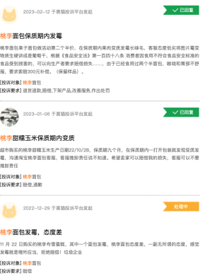 在黑猫投诉上,桃李面包品牌共有251条投诉,有消费者称在桃李全麦主食面包中吃到了苍蝇、活着的虫子等。绝大多数投诉也都围绕着保质期内发霉、吃出异物等。