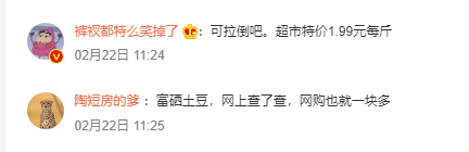 对于“18元一份的土豆就5片”,有网友表示不能理解,“超市特价1.99元每斤”“富硒土豆,网上查了查,网购也就一块多”。