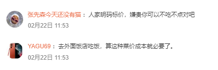也有网友表示,“人家明码标价,嫌贵你可以不吃不点对吧”“去外面饭店吃饭,算这种菜价成本就必要了。”