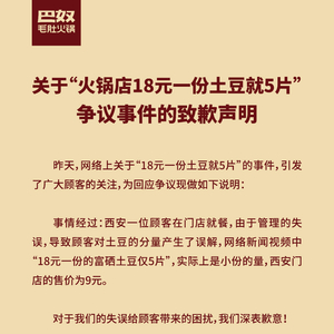 2月23日,巴奴毛肚火锅公众号发布关于“火锅店18元一份土豆就5片”争议事件的致歉声明。