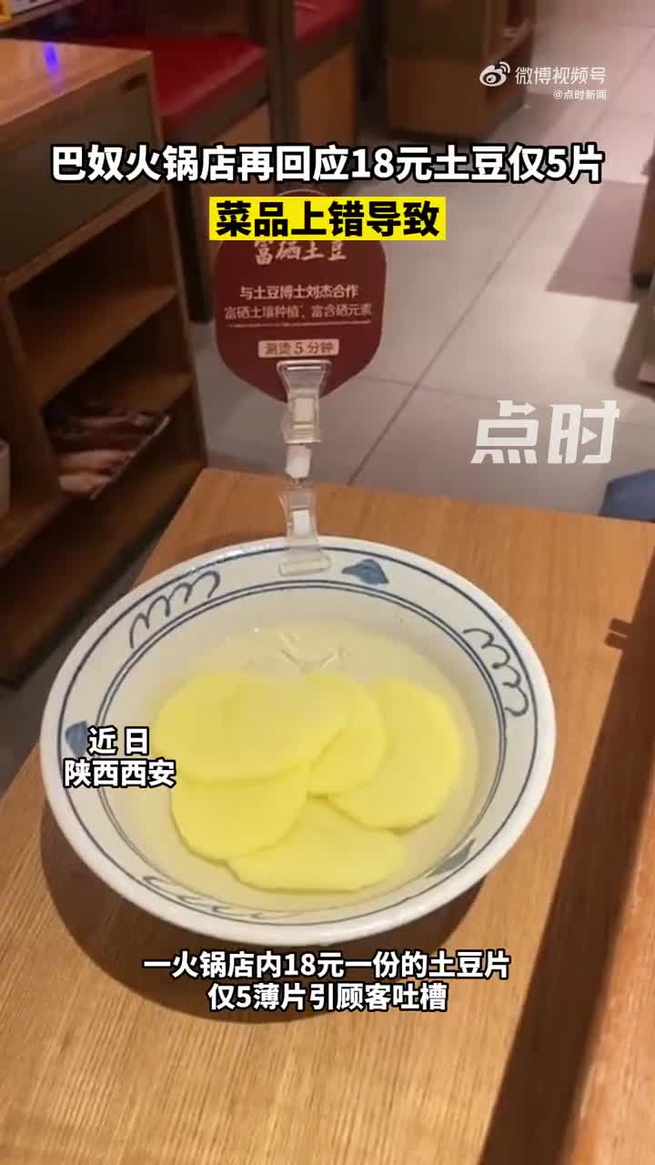 声明表示,西安一位顾客在门店就餐,由于管理的失误,导致顾客对土豆的分量产生了误解,网络新闻视频中“18元一份的富硒土豆仅5片”,实际上是小份的量,西安门店的售价为9元。