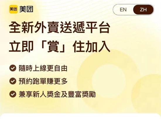2月20日,美团发布骑手招募启事,有两种模式可供骑手选择,分别是即时上线模式和预约时段模式。骑手类型分为车手、步兵和电单车。招聘信息上显示,新加入的骑手成功登陆后首十四天即享有单单有奖活动资格,有机会获得额外的2500港元。