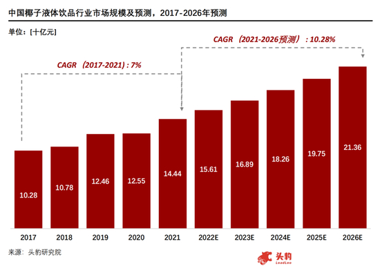 头豹研究院报告显示,2021年椰子液体饮品(包括椰子水和椰汁)行业市场规模约为140亿元,照此估算椰树一家就占了三分之一左右。