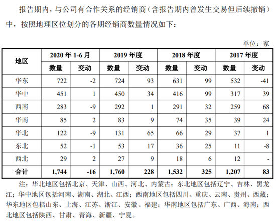 《招股书》显示,截至2020年上半年,李子园的经销商数量已达1744家,其中全年销售额50万元以下的1514家,占比超过八成。