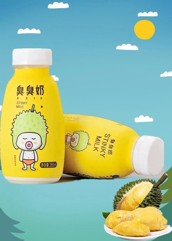 以臭臭奶为例,从选取年轻人喜爱的榴莲为口味,到外包装上卡通人物的蠢萌设计,都与李子园传统的“土味”包装有很大区别。