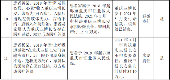 2018年至2021年6月,公司处理完成的医疗纠纷共73起,其中2018年、2019年、2020年和2021年1-6月处理完成的医疗纠纷分别有15起、33起、22起和3起,赔付金额分别约为245.45万元、760.89万元、452.63万元和66.44万元,收到医疗责任险理赔金额分别为187.84万元、341.77万元、145.14万元和41.21万元。