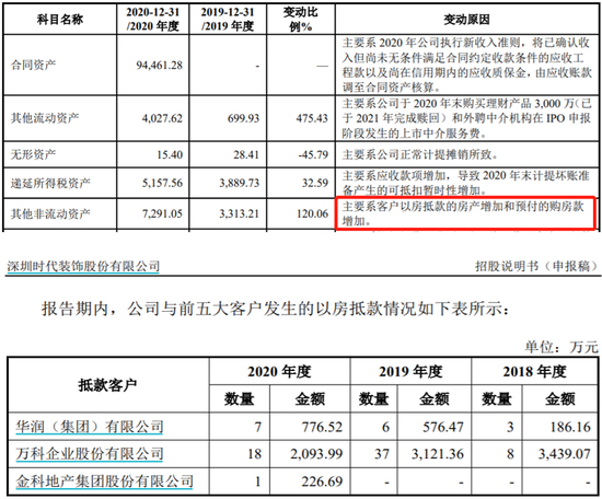 在时代装饰的招股书中披露,其2019年末计入到“其他流动资产”项下的、以房抵款即预付购房款为主体的金额为3313.21万元,到2020年末就增加到了7291.05万元,净增加近4千万元。2020年,时代装饰仅向大客户万科实施的以房抵款金额,就高达两千万元以上。