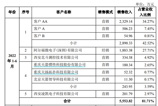 报告期内,公司向前五名客户销售金额分别为 5910万元、8701万元、12702万元和5554万元,占当期营收比例分别为74%、80%、76%和82%。关联销售金额分别为655万元、1976万元、4519万元和2890万元,占同期营收比例分别为8.2%、18.2%、27.2%和42.5%,比例增长明显。