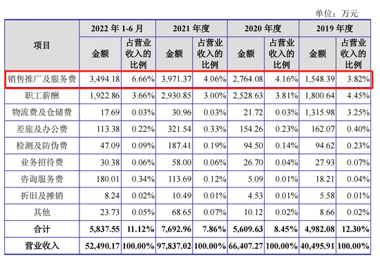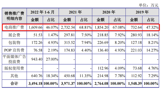 销售推广及服务费中,电商推广费又占比最高。2019-2022年上半年,公司电商推广费金额分别为732.64万元、1854.20万元、2732.54万元、1609.66万元,占比分别为47.32%、67.08%、68.81%、46.07%。