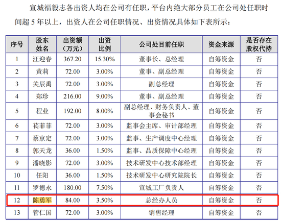 据企查查,华宠股份第二大股东陈勇军持有13.57%股份,同时,他还持有宣城福毅志3.35%的股份,进而间接持有福贝宠物0.12%的股份。招股书显示,陈勇军在福贝宠物的职位为总经办人员。福贝宠物称,宣城福毅志各出资人均在公司有任职,平台内绝大部分员工在公司处任职时间超5 年以上。