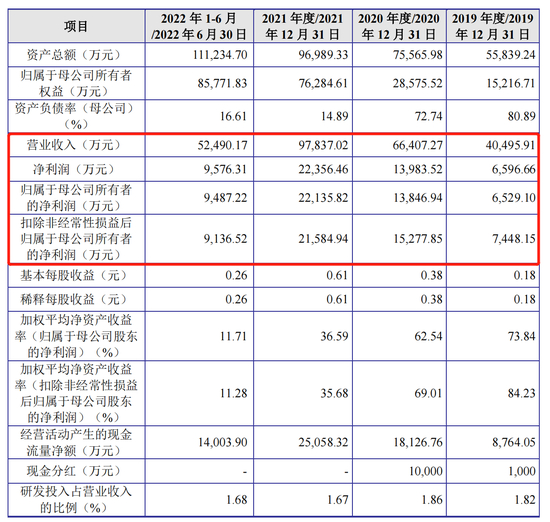 2019-2022年上半年,福贝宠物的营收分别约为4.05亿元、6.64亿元、9.78亿元和5.25亿元;净利润分别为6596.66万元、1.40亿元、2.24亿元和9576.31万元,扣非后净利润分别为7448.15万元、1.53亿元、2.16亿元和9136.52万元。