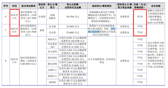 2017年,福贝有限引入外来投资者,毅达投资以货币9000万元认缴新增注册资本211.76万元,价格为42.50元/股;2019年4月,为激励员工,汪迎春转让部分股权给宣城福毅志(员工持股平台),价格同样为42.50元/股。