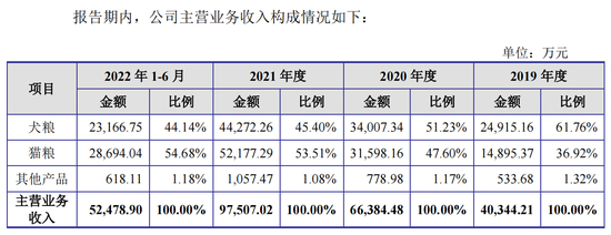 可以看出,猫粮业务毛利率从2019年最高时的44.96%下滑到2022年上半年的37.38%,下滑了7.58个百分点;犬粮业务毛利率从2020年的46.15%降至2022年上半年的40.47%。