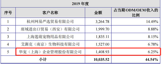 另外,福贝宠物前五大客户几乎全部为ODM/OEM客户,2019年的第五大客户为华宠(上海)企业管理股份有限公司(简称“华宠股份”),成立2016年12月,成立的第二年与福贝宠物建立合作关系。2018年至2020年,福贝宠物对华宠公司产生的销售金额分别为1645.93万元、1408.93万元、1471.31万元,分别为公司当年度的第3、第5、第7大客户。