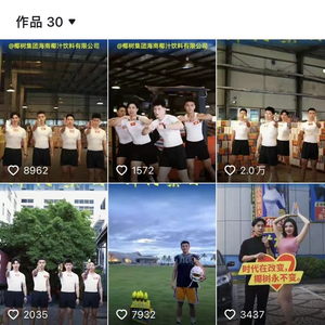 3月起,该账号发布视频的内容,便已都是以肌肉发达的年轻男性为主角。视频中,这些男主播们在时下网络流行歌曲中跳舞、秀肌肉、对着镜头比心、并展示椰树集团的产品,单个视频最高点赞量为2万。