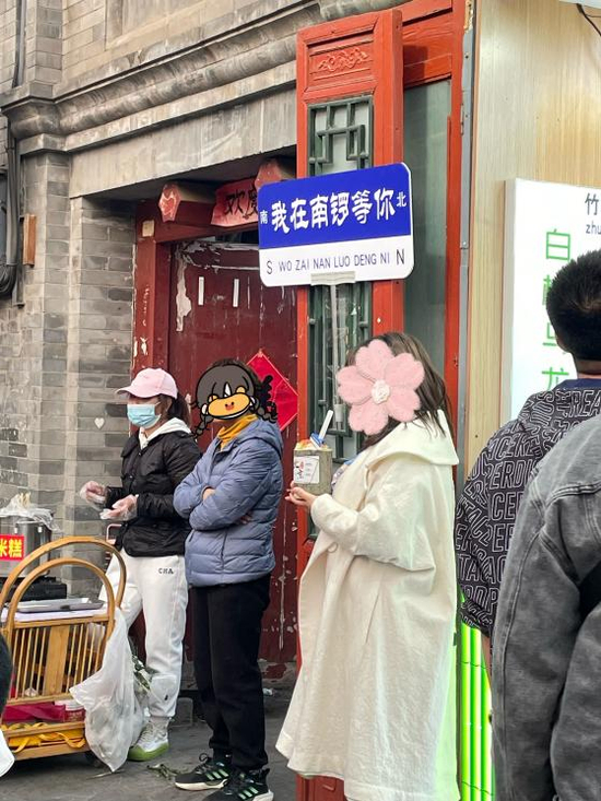 某个工作日下午两点多,南锣鼓巷入口处第一家竹筒奶茶店叫号叫到了198号,等到快六点笔者离开时,号码到了489号。依然有源源不断的游客对门店投来好奇的目光,偶尔有人会停下脚步,到窗口点上一杯,然后捧着竹筒奶茶,在旁边的“我在南锣等你”路牌下拍张照片。