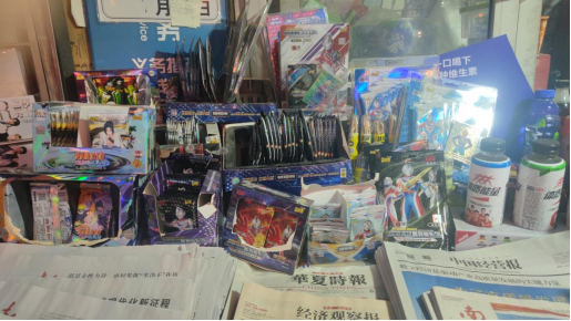 这些卡牌,多来自学校周边的店铺。近日,新浪财经走访了几所小学,在海淀实验小学附近的便利店和路边报亭,均陈列着大量奥特曼、斗罗大陆以及火影忍者卡牌。其中,又以卡游等公司推出的“奥特曼”卡牌最为引人注目。