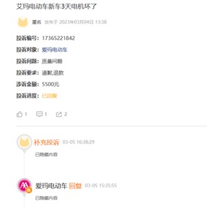 仅仅三天电动车就坏了,如果该起投诉属实的话,显然将对爱玛电动车的质量形象以及潜在购买力会造成影响。