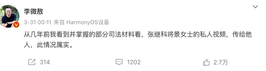 3月31日凌晨,李微敖发布微博称,张继科泄露女明星私人视频情况属实。