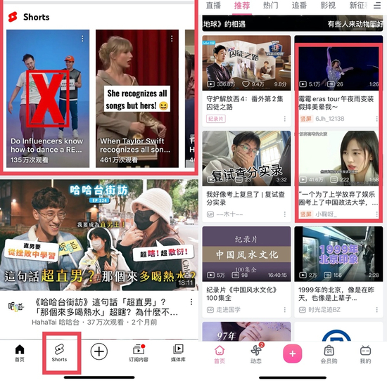 YouTube Shorts(左图)和B站(右图)短视频展示模式的对比