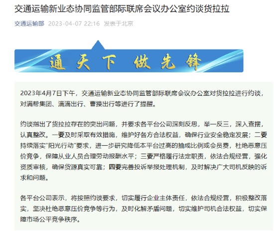 冰冻三尺非一日之寒。即便在递表谋求上市后,约谈也同样到来。2023年4月7日下午,交通运输新业态协同监管部际联席会议办公室对货拉拉进行约谈,对满帮集团、滴滴出行、曹操出行等进行了提醒。