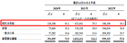 2020至2022年三年内,货拉拉销售费用占收入比重分别为45.1%、79.7%以及19.1%。可以看到,2021年销售及营销占收入的比重高达79.7%,折合6.73亿美元,而2022年骤然下滑到19.1%,折合1.98亿美元,销售费用得到很大程度的控制和削减。