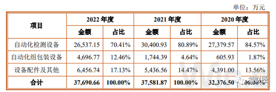 其中,公司主营业务收入主要来源于自动化检测设备的销售,自动化检测设备的销售收入占主营业务收入的比例分别为84.57%、80.89%和70.41%。