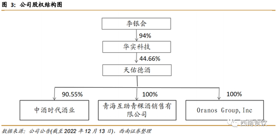 民营控股,股权结构稳定。公司是民营体制,具有经营自主性高、管理决策灵活、组织架构扁平化的突出优势。董事长李银会为公司实际控制人,截至2022年12月13日,其间接持有天佑德酒41.98%的股份,股权集中度高,经营目标与股东利益高度一致。