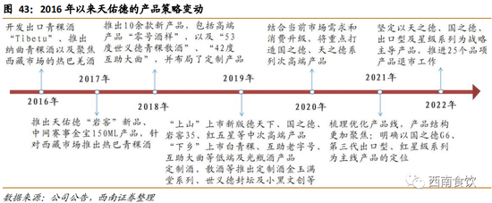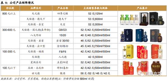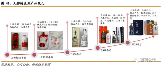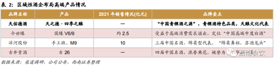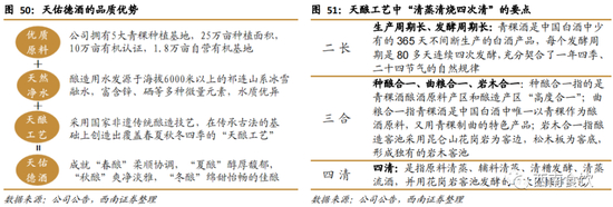 区域品牌超前布局,高端产品竞相涌出。部分区域性酒企出于品牌形象塑造和引领产品结构升级的目的,竞相超前布局高端产品,高端产品品类得到有效扩容。得益于在区域市场的品牌影响力和渠道优势,部分区域品牌的高端产品渐露头角,获得一些忠实消费者的认可;此外,区域品牌具有一定本土文化属性,在官方交流、商务活动等场合常常作为本土特色频繁亮相,一定程度上也带动了其品牌影响力的提升,在当地高端市场获取一定市场份额。天之德·四季之酿遵循季节天时酿酒,“春酿柔顺、夏酿醇厚、秋酿净爽、冬酿绵甜”的口感独特,诠释了中国白酒酿造工艺“顺应自然、天人合一”的伟大智慧,是中国白酒自然酿造的代表之作。此外,天佑德酒作为青海白酒龙头,具有众多忠实消费者和强势的销售渠道,其高端产品在青海白酒市场占据一定市场份额。