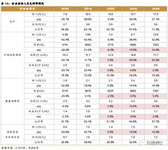 2)受益大众消费持续升级,消费者品牌意识持续增强,公司将充分受益省内品牌集中度提升红利,预计普通青稞酒2022-2024年销量同比增长-2.0%、5.0%、5.0%,吨价同比增长2%、10%、10%,毛利率为51.7%、54.8%、57.7%。