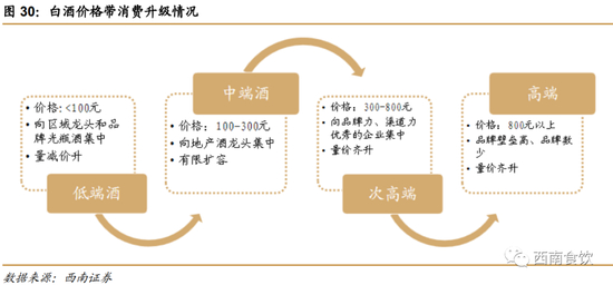 在消费升级驱动下,各档次白酒价格中枢稳步上移。高端白酒已打开价格空间,完成了 消费者培育,未来市场将稳健扩容;在消费升级拉动和渠道推动下,次高端将出现量价齐升, 具备品牌力和渠道力双重优势的企业,将更具爆发力;中档酒作为大众消费升级的跳板,仍 具提价空间,但市场扩容有限;低档酒价格将有所提升,但销量将趋于萎缩趋势。