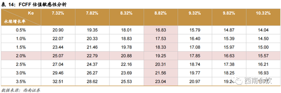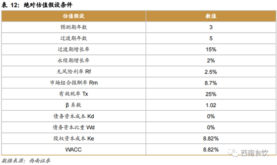 2) 企业现金流充裕,基本无负债,假设债务资本成本、债务资本比重均为0%;