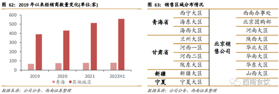 做强基地市场,渗透战略市场,加速全国化布局。区域布局上,公司围绕扎根青海、立足西北、拓展全国、布点全球的战略,持续拓展成长空间。公司持续夯实青海大本营市场,深入推进甘青一体布局,不断做强基地市场;进一步强化陕西、北京、河南等战略布局市场团购型客户培育及样板市场开发,不断提升市场渗透率;持续推进全国化布局,积极布局国际化市场,成长空间不断拓展。