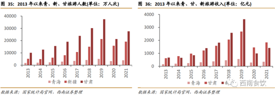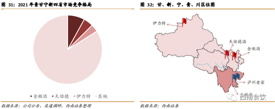 西北饮酒氛围浓厚,升级迟滞发展落后。西北地区地广人稀,经济水平相对落后,消费能力与内地差距较大。新疆、青海、甘肃、宁夏等区域,酒类消费氛围浓厚,四个省份白酒市场容量共计在200亿元左右;其中青海地区白酒市场容量在30亿元左右,主要集中在西宁市和海东市。西北因经济发展慢于中西部,地产酒品牌产品结构升级节奏慢于内地品牌,导致西北地产酒在2016年以来的白酒行业复兴进程中略显迟钝。川酒因地理优势,对西北白酒市场的影响尤为深刻。