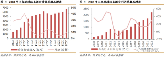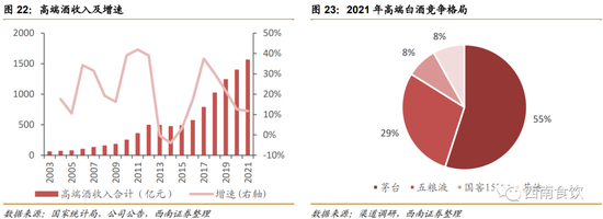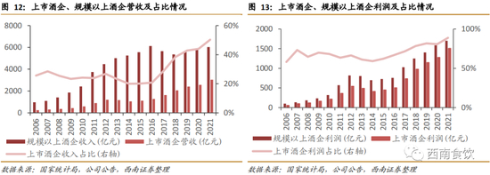 结构性繁荣特征明显,名优白酒市占率快速提升。本轮白酒复苏以来,“弱增长,强分化”的结构性繁荣特征十分明显。在此背景下,名优白酒品牌和渠道优势越发明显,市场份额加速向名优白酒集中。白酒上市公司(多为名优白酒)的收入和利润市占率分别从2015年的20%、62%提升至2021年的50%、89%。特别是自2017年以来,在居民消费升级步伐显著加快的背景下,名优白酒迎来爆发式增长,上市公司份额占比快速提升。